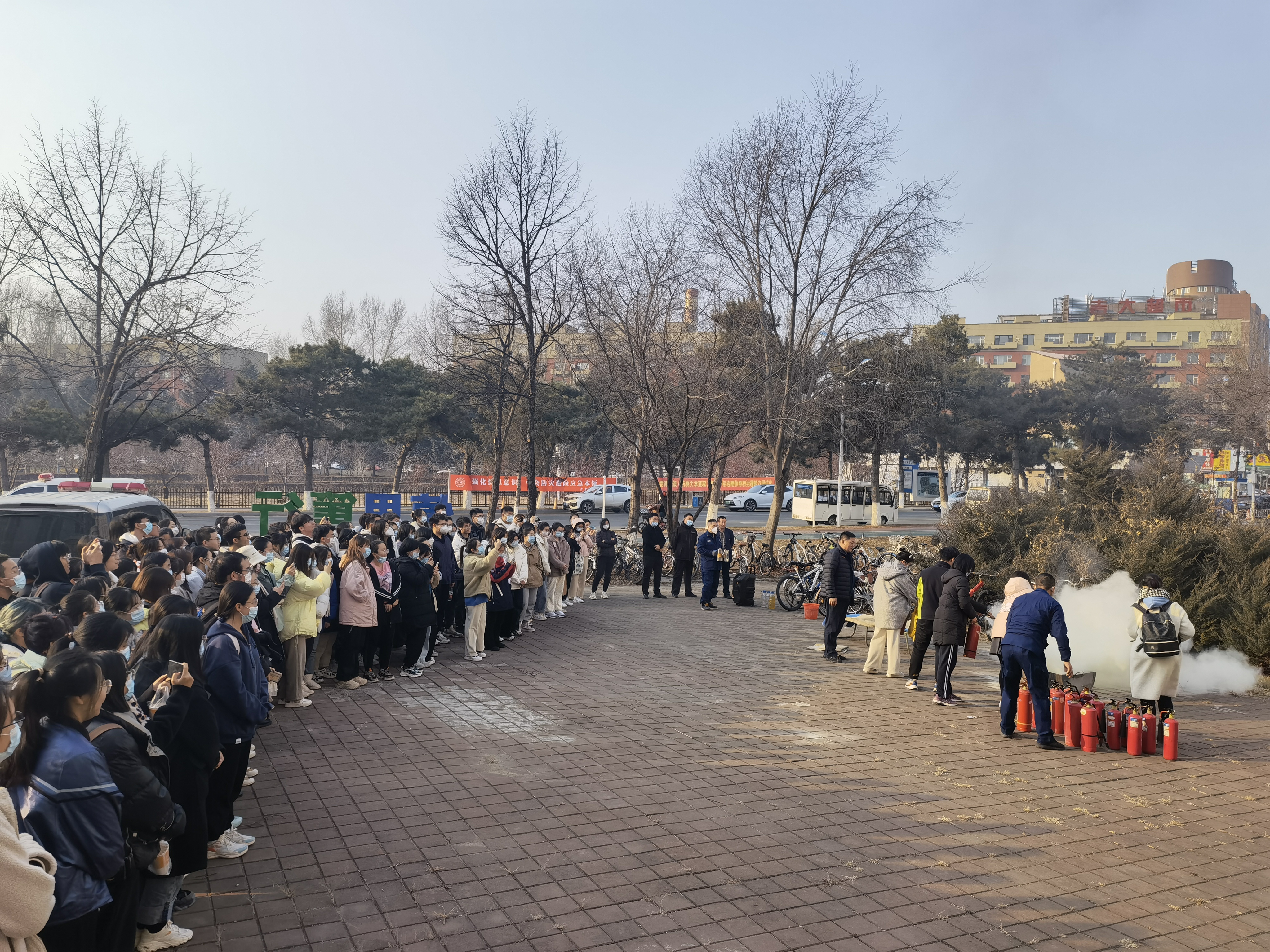 保卫处消防科副科长董立明结合视频和图片,分析了近年发生的大型火灾事故发生的主要原因,阐述了消防安全的重要性。详细讲解了干粉灭火器的用法,现场展示了如何灭火并带领同学们进行灭火实操。随后,师生们在警报声中有序撤离,集合至演练场地,保卫处工作人员为现场师生详细讲解了灭火器、灭火毯等消防器械正确使用方法并做了演示,师生们也积极踊跃的参与到实战灭火演练。