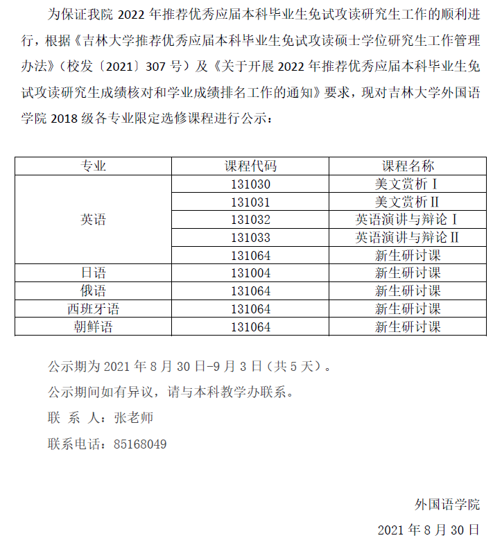 下一条:关于《外国语学院推荐优秀应届本科毕业生免试攻读研究生工作细则》及《吉林大学外国语学院本科生素质类项目加分标准》的公示